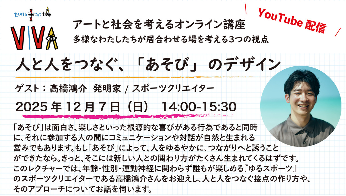 全てのレクチャーはYouTubeにて生配信を行います。たいけん美じゅつ場でのご参加も可能です。配信当日24時までご覧いただけます。
